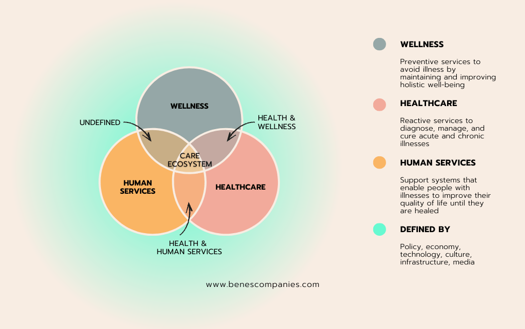 As we have continued conducting our semi-structured interviews with professionals in the health, wellness, and human services space, we’ve discovered that there is no single term to cover the spectrum of products and services that are required to restore a person to a thriving state. Therefore, we decided to try out the phrase, “care continuum” to represent the entire breadth of products and services that can improve human well-being including: wellness, health care, and human services industries.